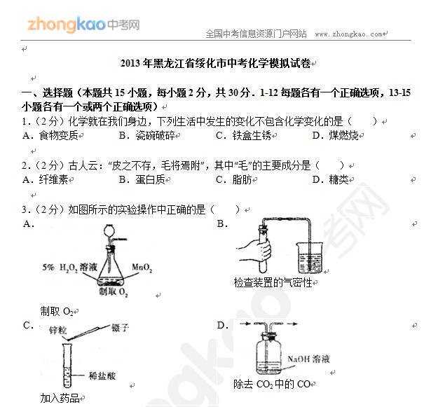 2013年黑龙江省绥化市中考化学模拟试卷答案