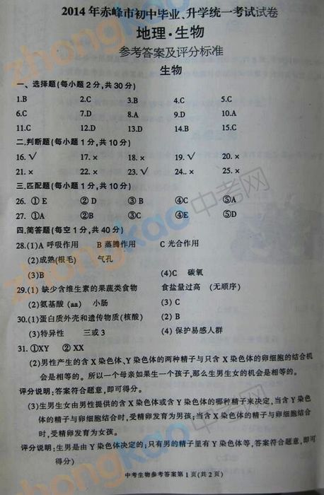 2014年赤峰中考生物试题及答案(扫描版)(9)