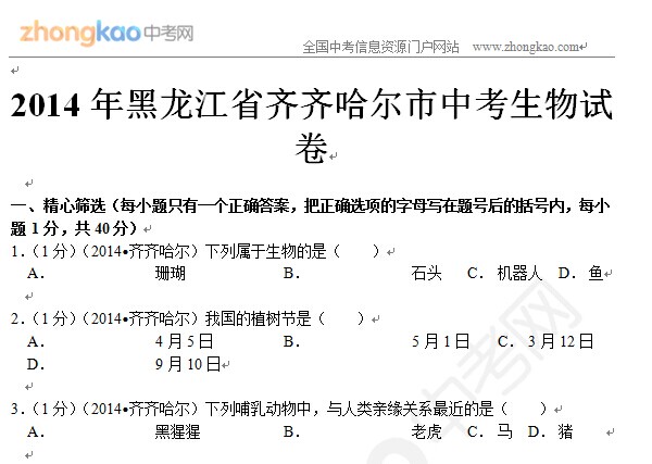 中考网精编2014齐齐哈尔中考生物试题及答案供广大考生参考下载。