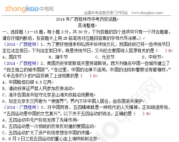 中考网精编2014广西桂林中考历史试题及答案供广大考生参考下载。