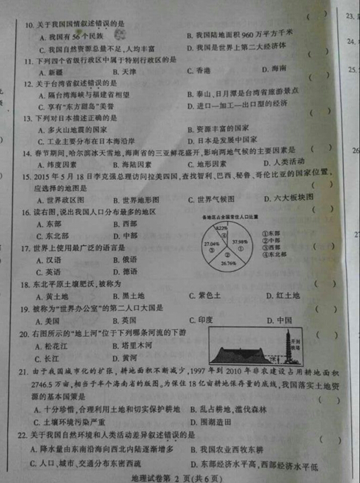2015哈尔滨中考地理试题公布(图片版)(2)