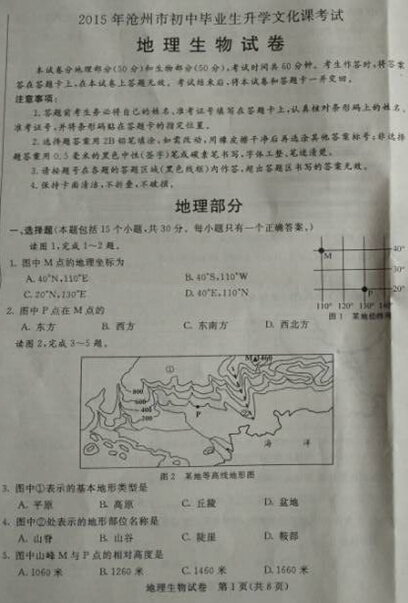 2015河北沧州中考地理试题公布(图片版)