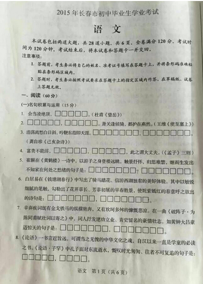 2015长春中考语文试题公布(图片版)