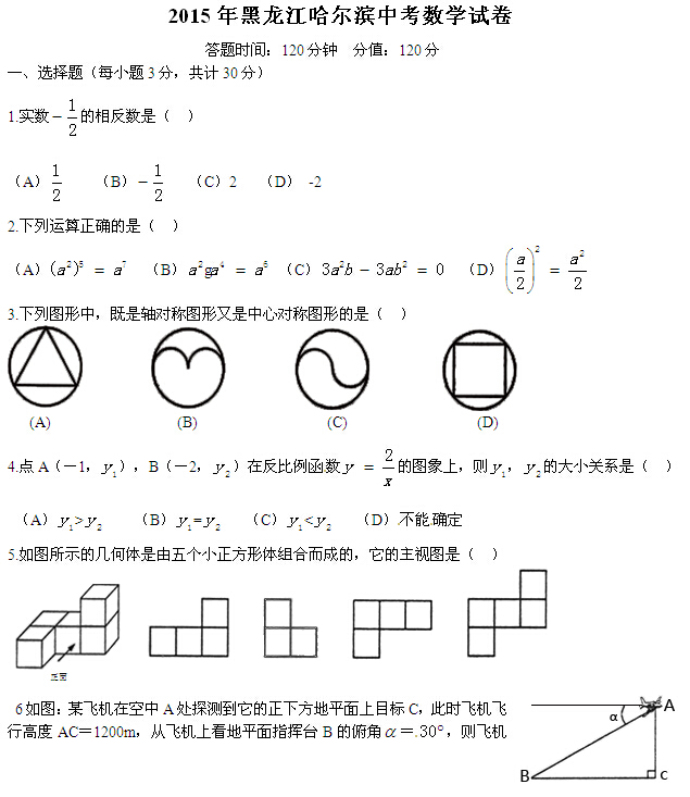 2015哈尔滨中考数学试题公布(图片版)