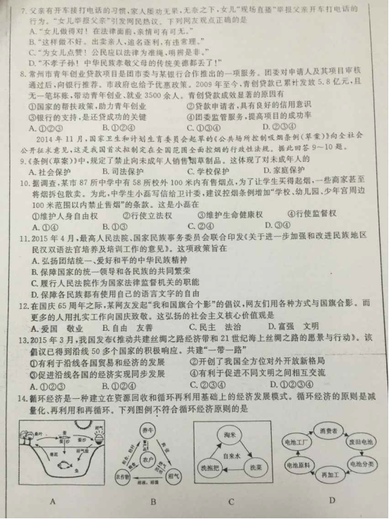2015年常州中考思想品德试题公布(图片版)(2)