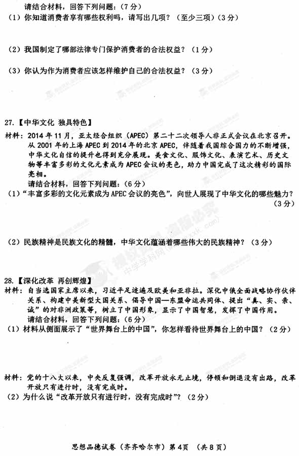 2015年齐齐哈尔中考思想品德试题公布(图片版)(4)