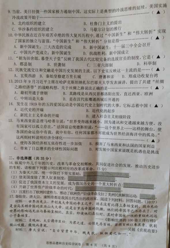 2015年锦州中考思想品德试题公布(图片版)(2)