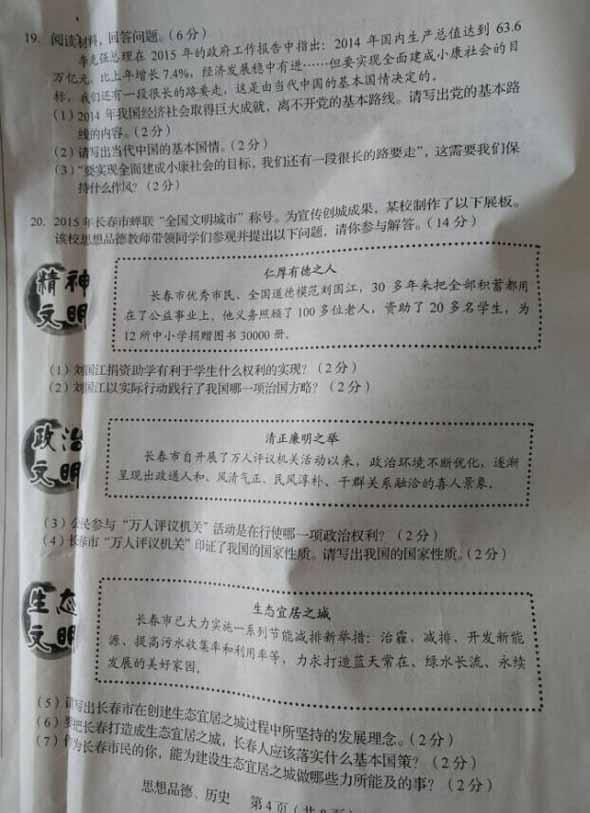 2015年长春市中考思想品德试题公布(图片版)(3)