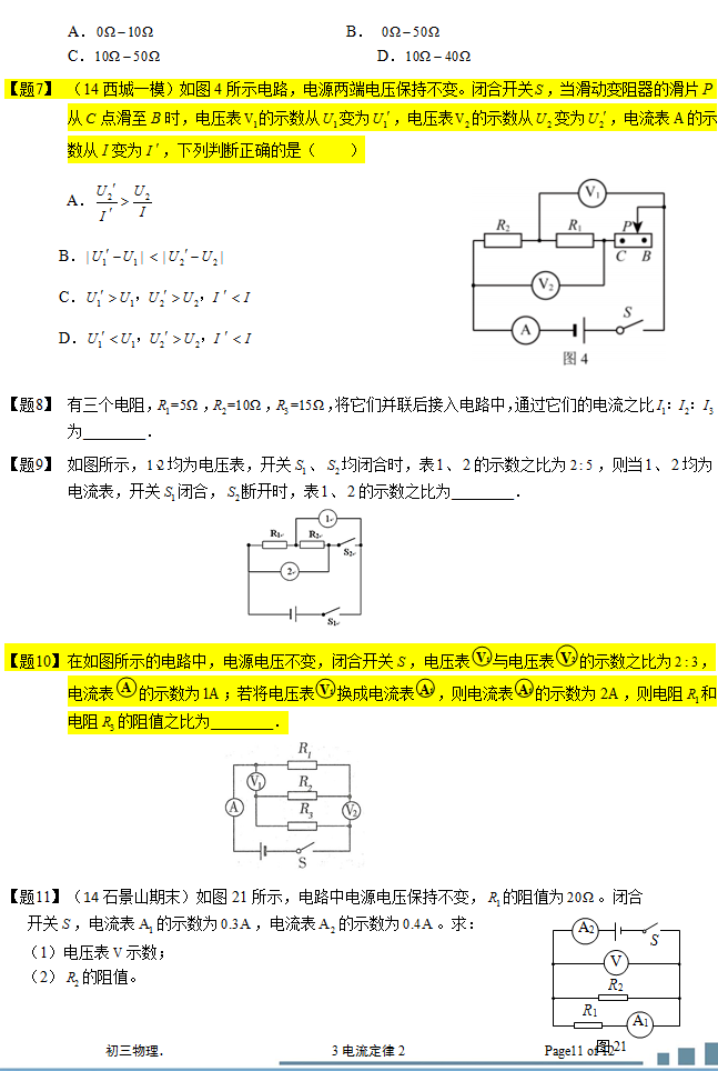 中考物理考点练习题集锦:欧姆定律的应用(10)