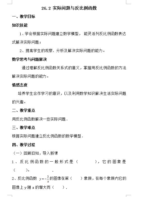 人教版九下数学26.2反比例函数在实际中的应用教案(下载版)
