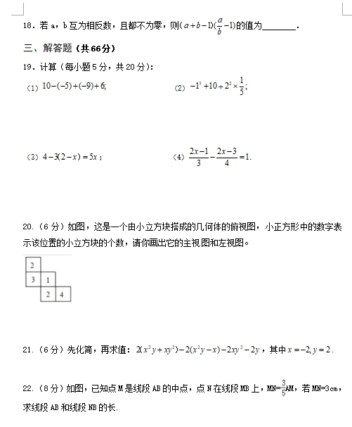 甘肃白银育才2017-2018七年级上期末数学试题(图片版)(3)
