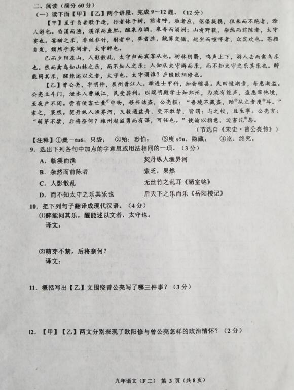 2018辽宁抚顺初中升学考试语文模拟试卷(二)(图片版)(3)