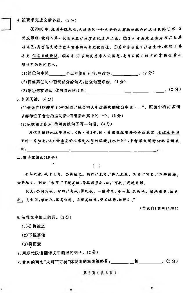 2018辽宁大连初中毕业升学模拟考试(一)语文试题(图片版)(2)