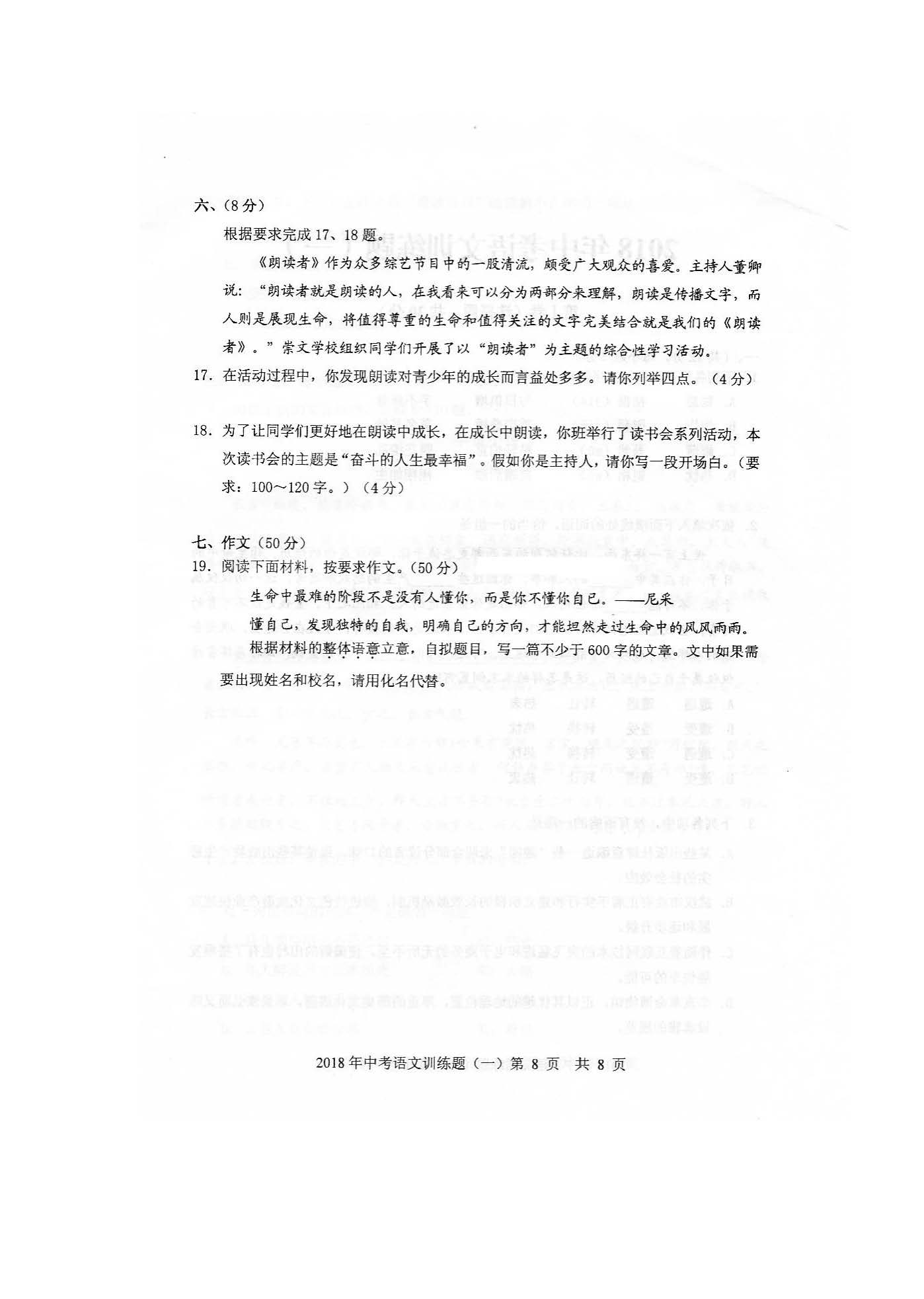 2018吉林农安靠山中学中考语文训练题(一)(图片版)(8)