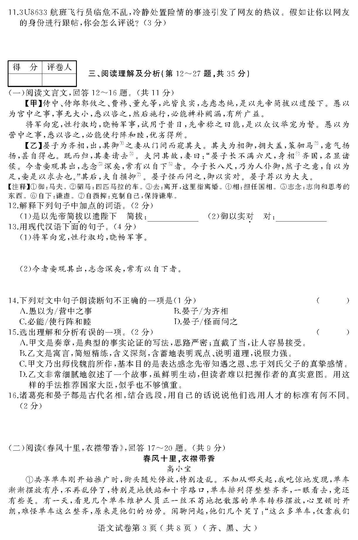 2018黑龙江齐黑地区九年级升学模拟大考卷(六)语文试题(图片版)(3)