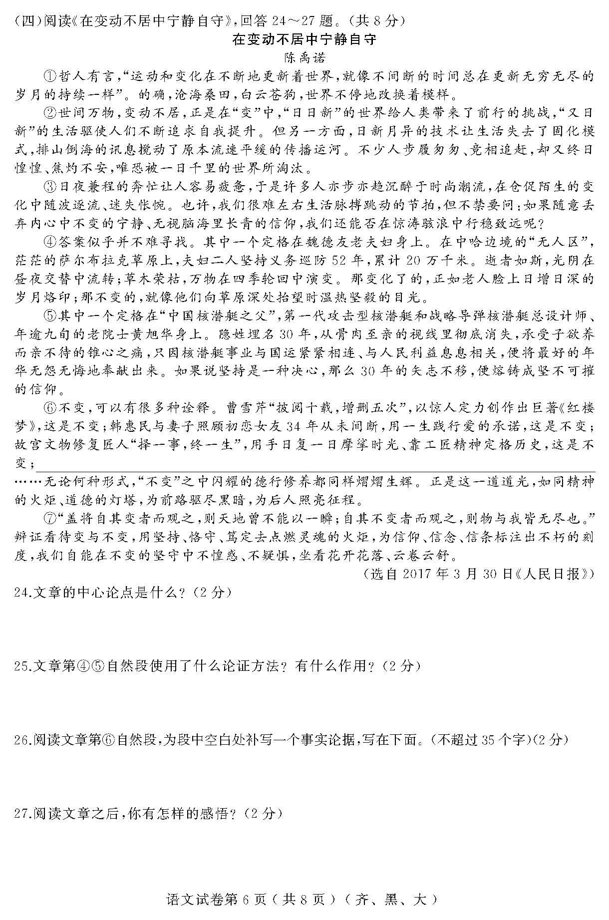 2018黑龙江齐黑地区九年级升学模拟大考卷(六)语文试题(图片版)(6)