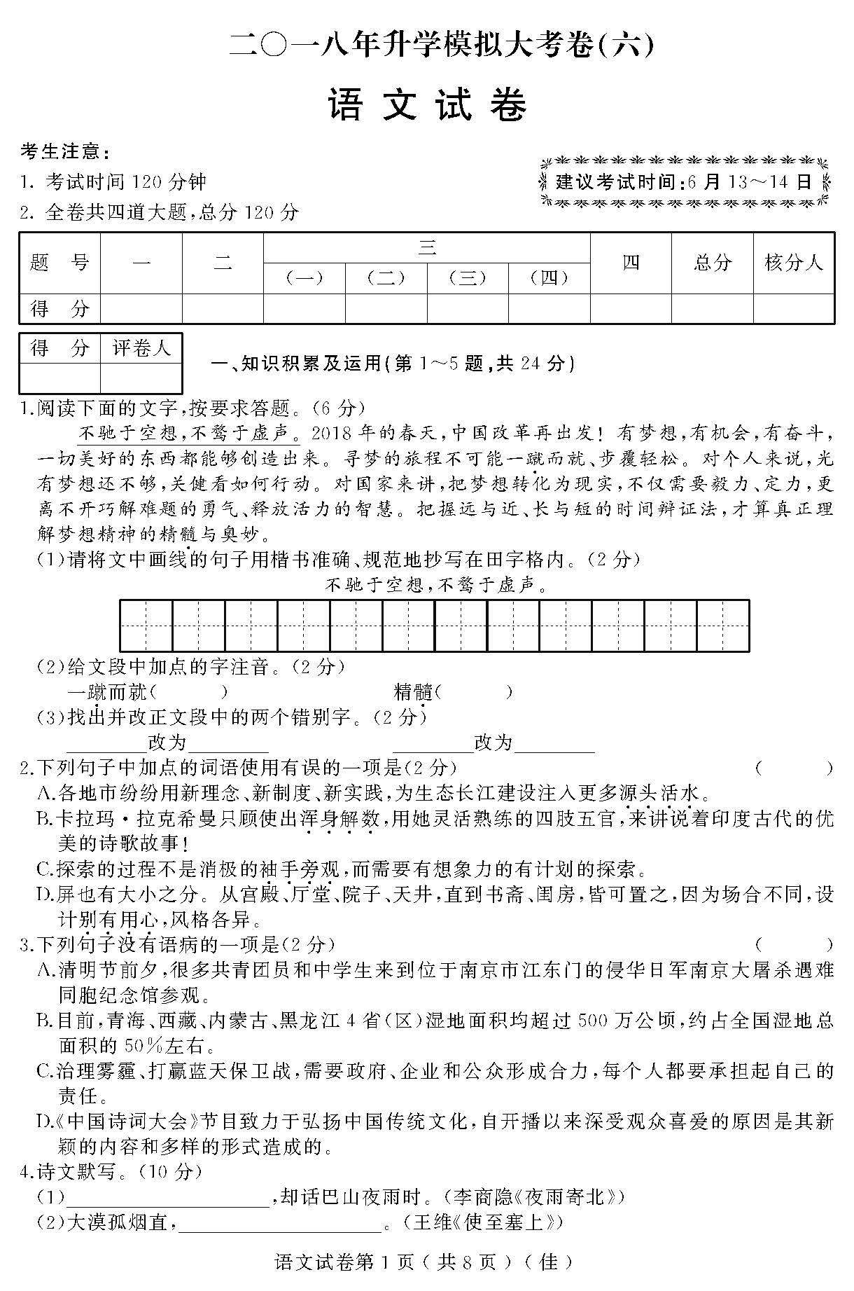 2018黑龙江佳木斯升学模拟大考卷(六)语文试题(图片版)如下: