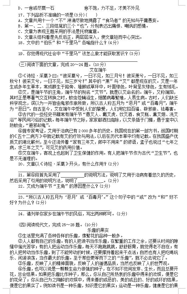 2018黑龙江安达四中语文中考模拟试卷一(图片版)(3)