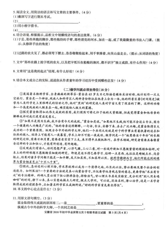 2018安徽省初中毕业班第五次十校联考语文试题(图片版)(3)