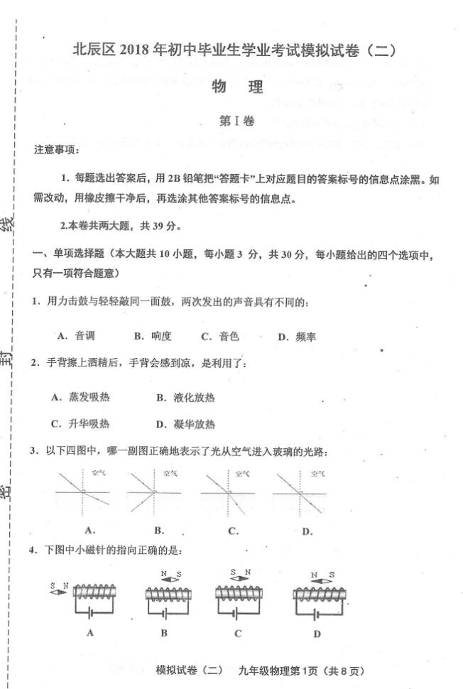 2018天津北辰初三物理二模试题(下载版)如下: