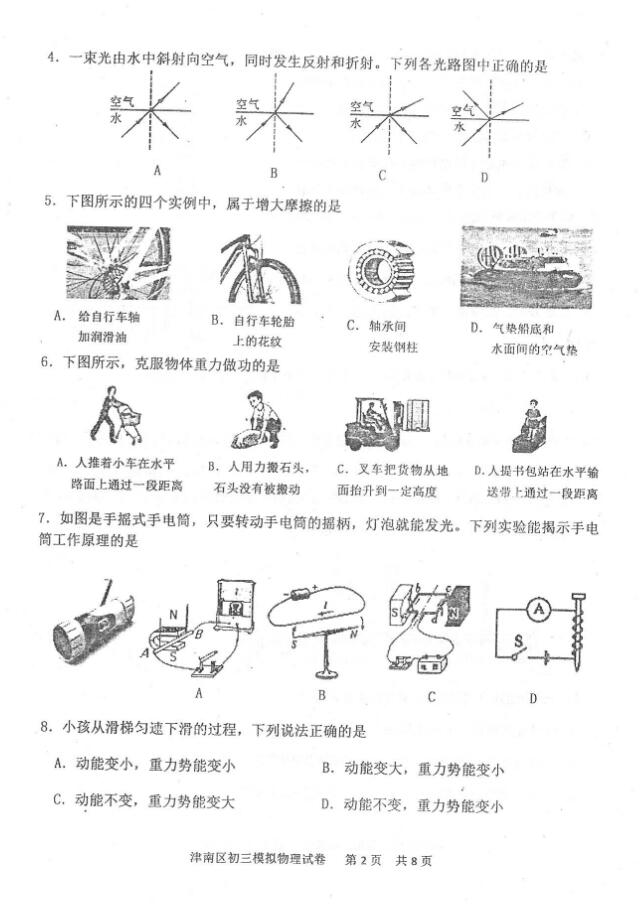 2018天津津南区初三物理模拟试题(图片版)(2)