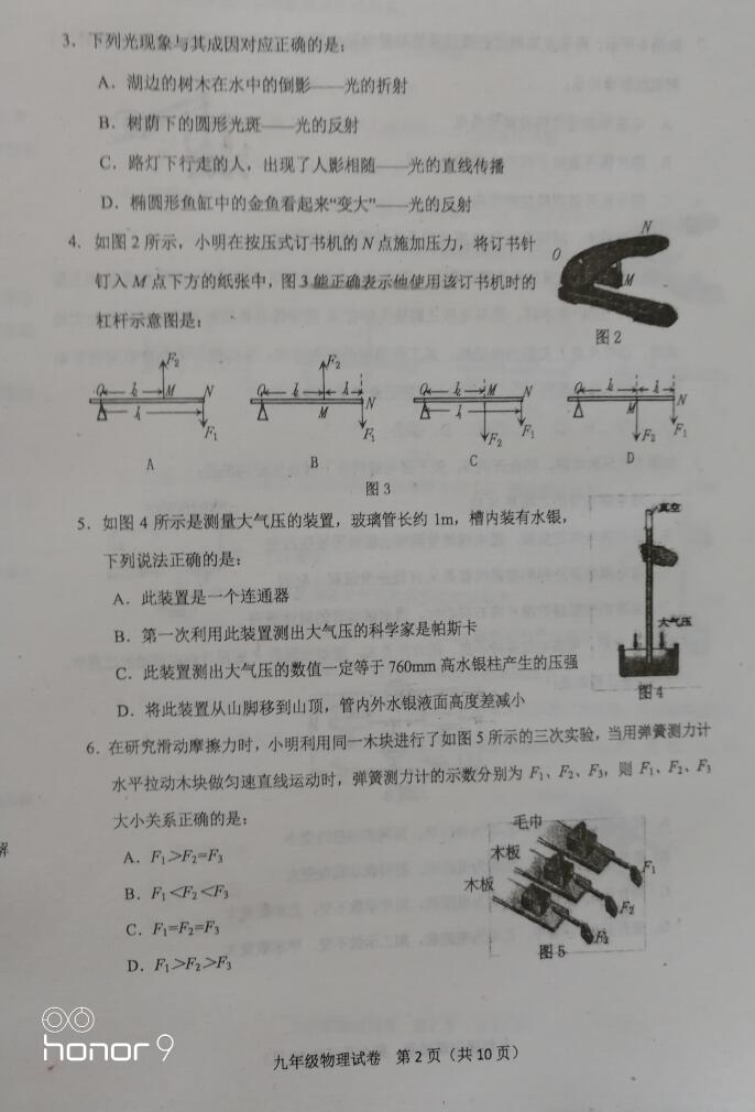 2018天津河东中考模拟考试物理试题(图片版)(2)