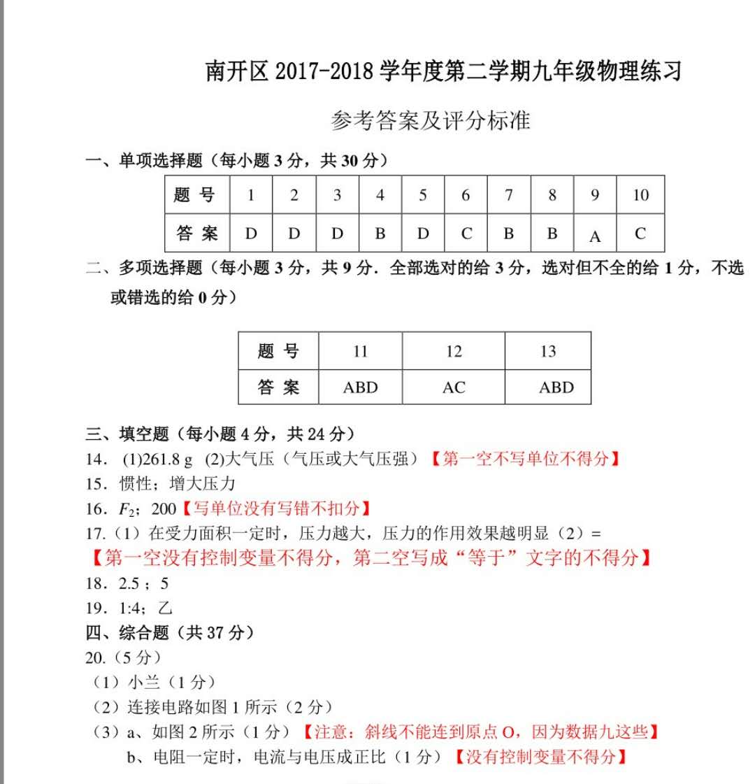 2018天津南开九年级一模物理答案(图片版)如下:
