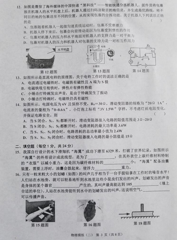 2018辽宁台安初中升学考试物理模拟试卷(二)(图片版)(3)