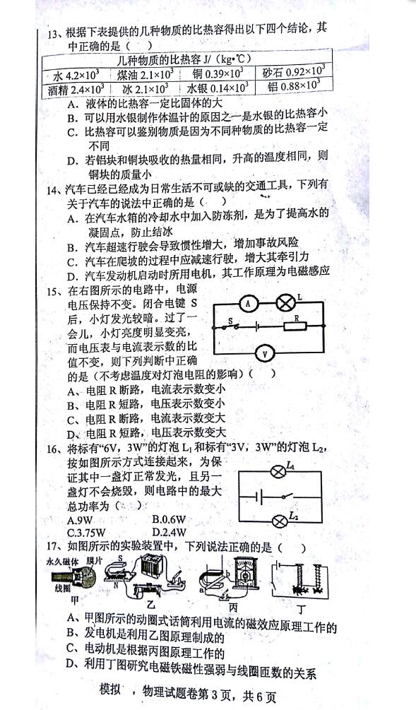 2018安徽初中毕业学业考试物理模拟试题(图片版)(3)