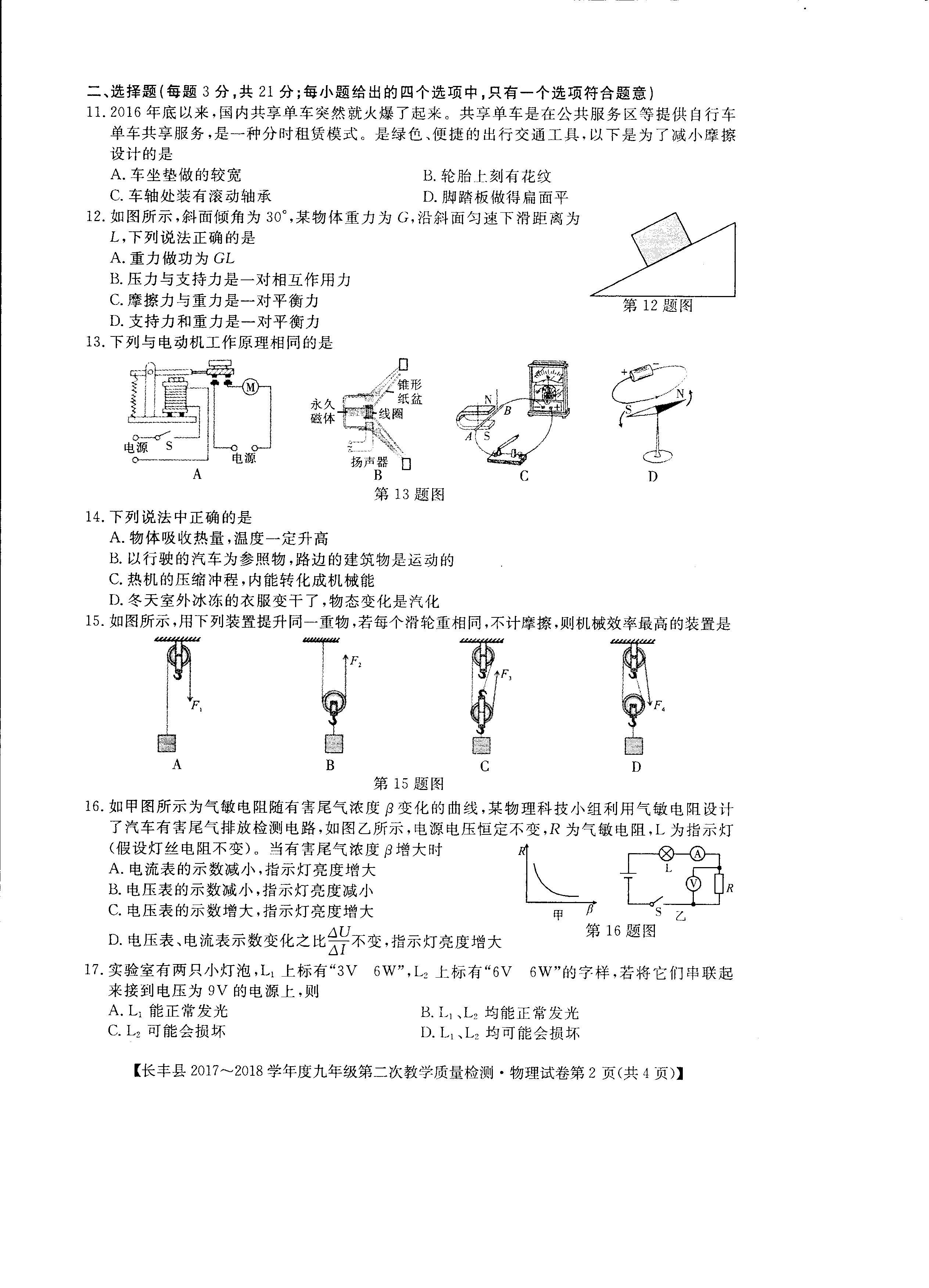 2018安徽合肥长丰九年级下第二次质检物理试题(图片版)(2)