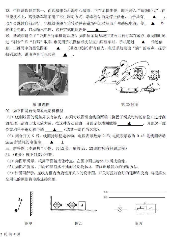 2018江苏盐城中学九年级下一模物理试题(图片版)(4)
