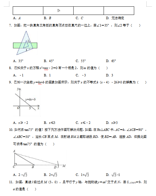 2019山东济南平阴第二中学中考数学三模卷a(图片版)(2)