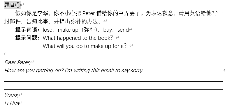 书面表达题目注重创设贴近学生真实生活的情境。题目①创设李华不小心把Peter的书弄丢了,为表达歉意写一封邮件的交际情境。