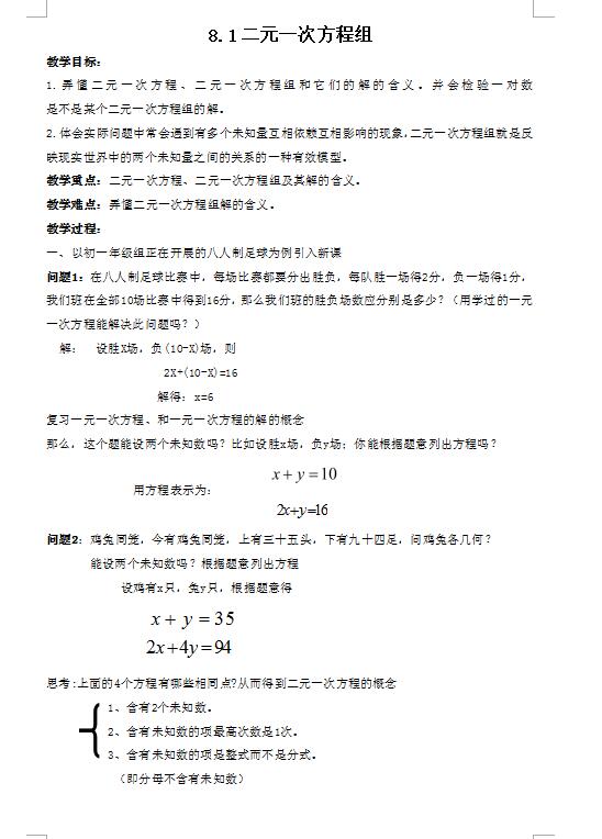 人教版七下数学8.1二元一次方程组教案(下载版)