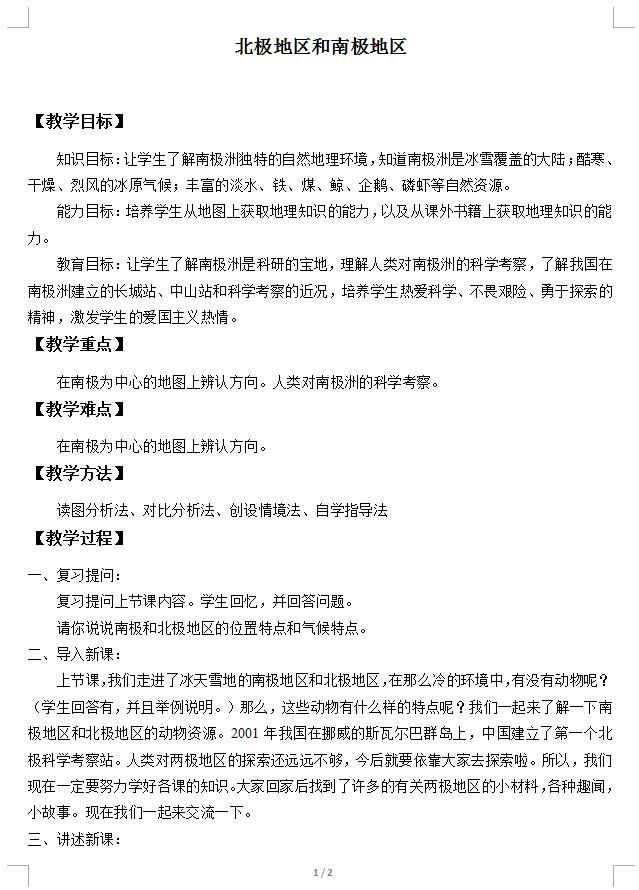 湘教版地理七下第七章第五节北极地区和南极地区教案(下载版)