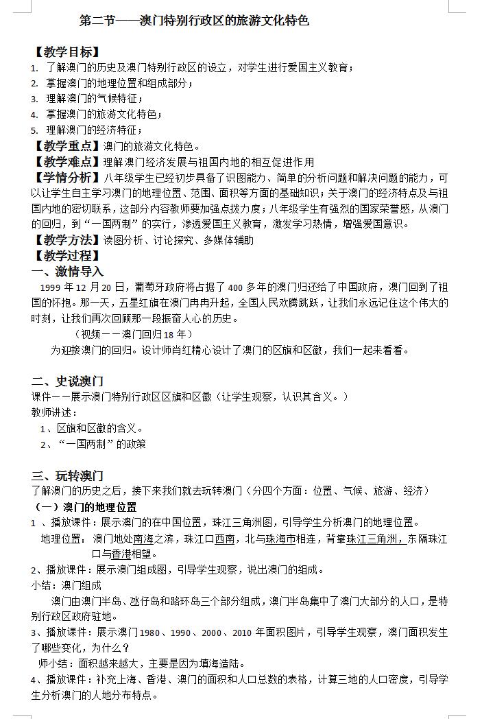 湘教版八下地理第7.2澳门特别行政区的旅游文化特色教案(图片版)