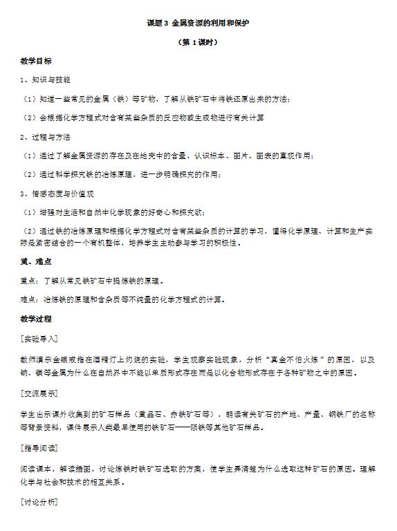 人教版化学九下课题3金属资源的利用和保护(第1课时)教案(下载版)