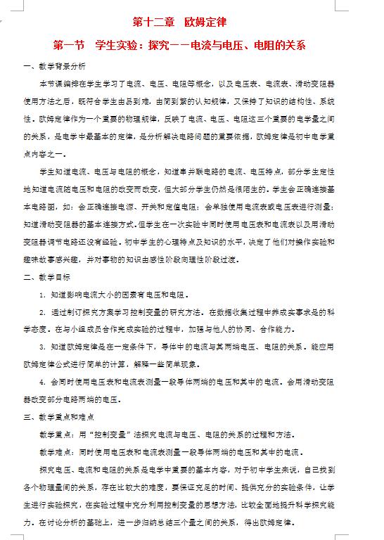 北师大版九年级物理全册12.1探究电流与电压电阻的关系教案(下载版)