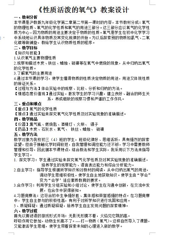 沪教版初中化学九上2.1性质活泼的氧气教案(下载版)
