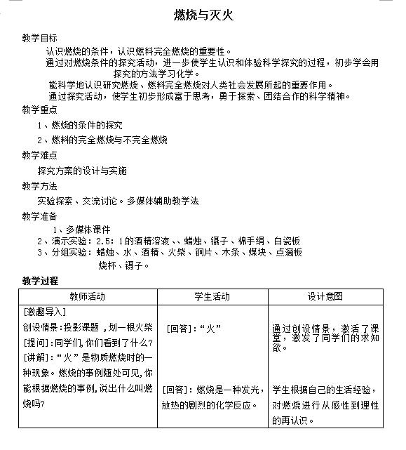 沪教版初中化学九上4.1燃烧与灭火教案(下载版)