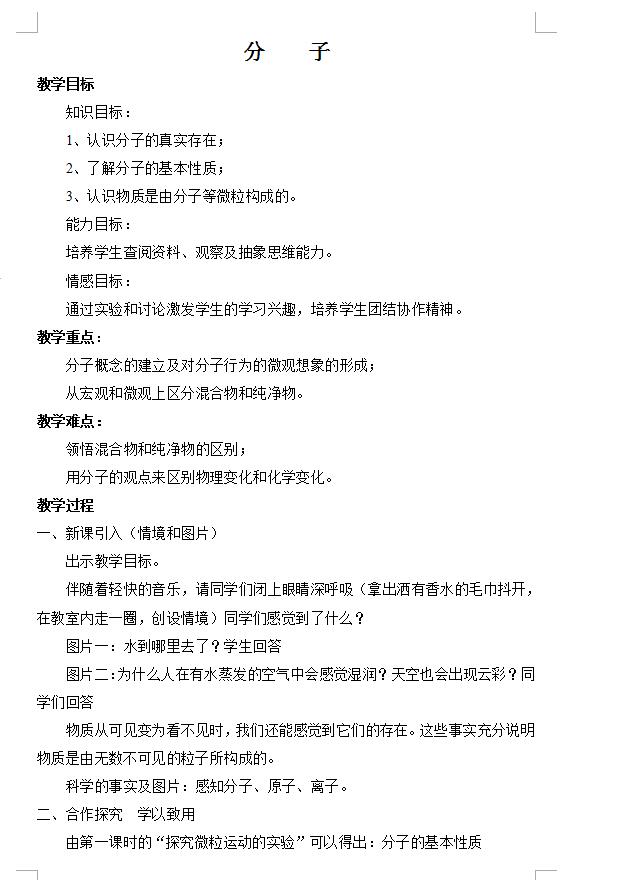 沪教版九上化学3.1.1构成物质的基本微粒 分子教案(图片版)