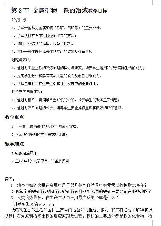 沪教版九上化学5.2金属矿物 铁的冶炼教案(图片版)