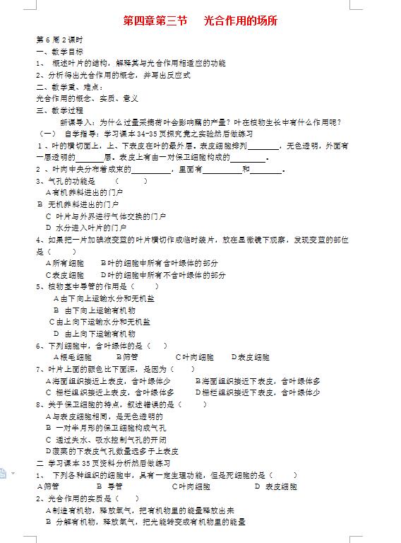 冀教版八上生物3.4.3光合作用的场所教案(图片版)