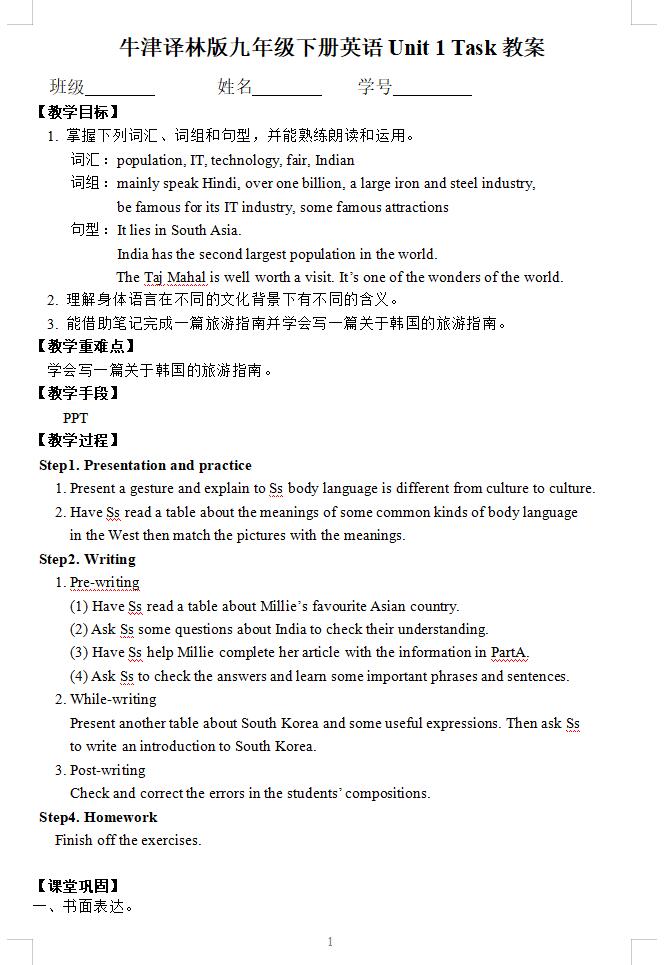 牛津译林版九下Unit 1 Asia Task 教案(图片版)