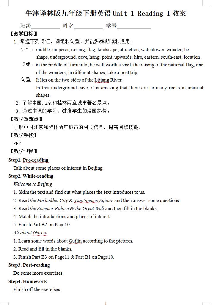 牛津译林版九下英语Unit 1 Asia Reading I教案(下载版)