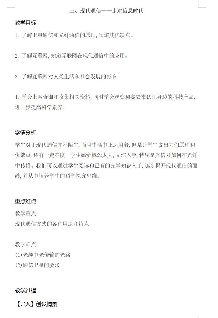苏科版九年级物理17.3现代通信走进信息时代教案(下载版)
